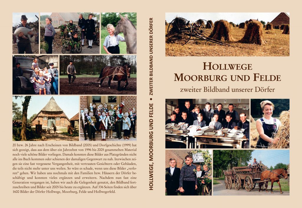 Der Bildband Hollwege, Moorburg und Felde in Bildern von gestern und heute erschien 2005. Seitdem wurden bereits über 600 Bücher verkauft. Die Dörfer werden in diesem Bildband in vielfältiger Weise vorgestellt. In Form eines Rundganges werden Höfe und Familien gezeigt. Aufnahmen aus der Schule, den Vereinen, dem Handwerk, der Landwirtschaft geben einen Einblick in das Leben der Einwohner. Auf mehr als 220 Seiten werden über 700 Bilder mit kurzen Texten abgedruckt. Das Buch ist im Format 24 x 32 cm mit festem Einband hochwertig hergestellt und kann hier für 25 € oder bei Günter Arens, Dirk Oltmanns und Fredo Wilken erworben werden.
